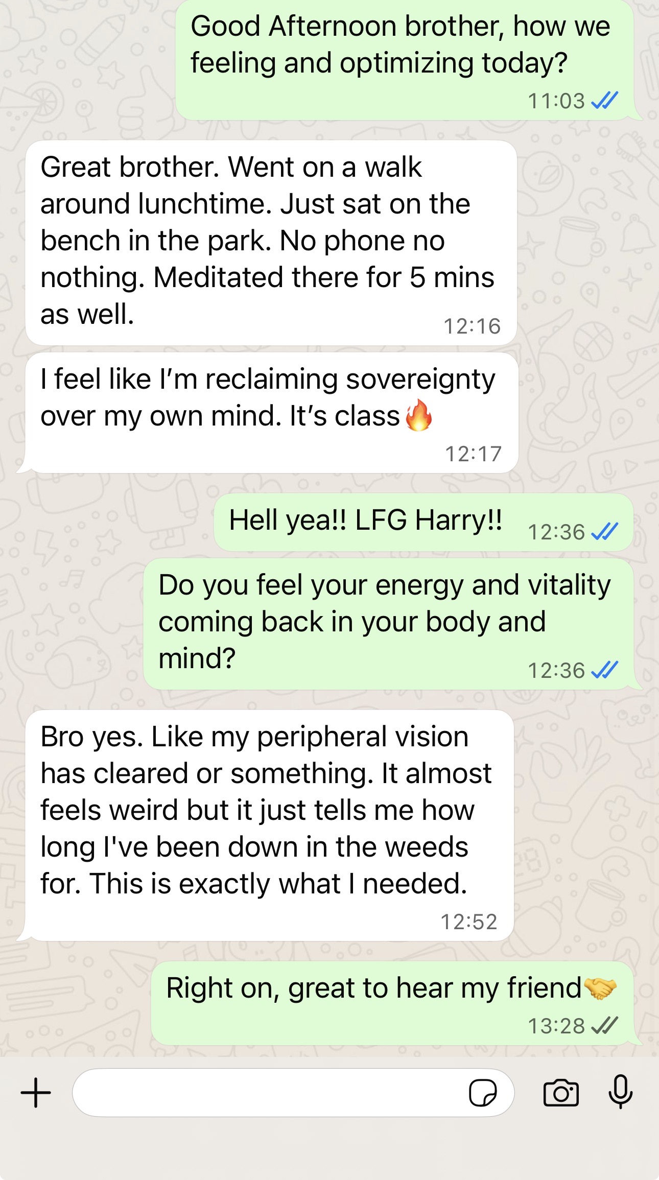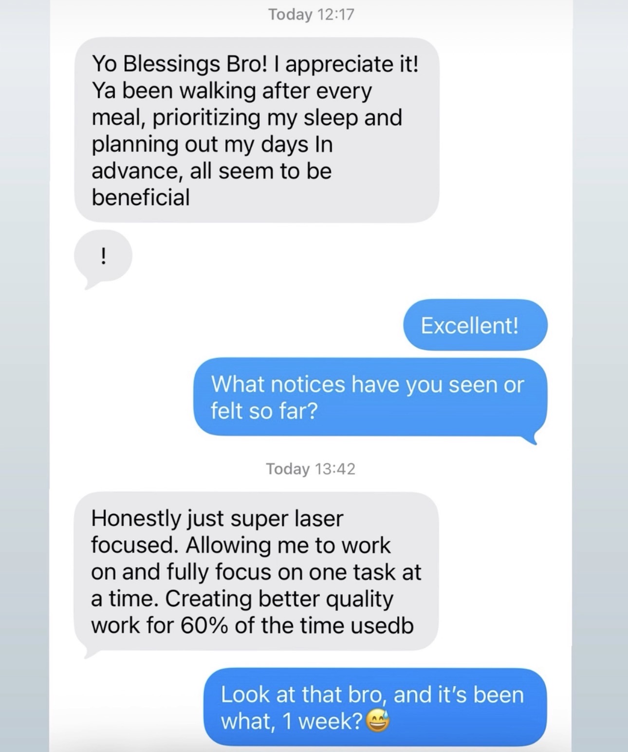 Most clients feel a noticeable shift in 4-7 days—sharper focus, clearer mornings, deeper sleep. But the real transformation compounds over 30–90 days as the full protocol kicks in and your body fully adapts. You'll see the difference in your energy first, then your close rate, then your bank account.